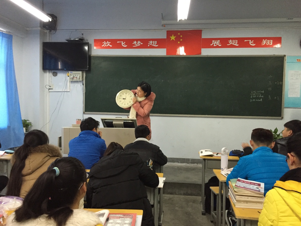 李娜老师讲授的内容是时间的表示方法。在教学过程中,李娜老师巧妙的方法——几条有关时间的英语谚语,引出珍惜时间的观念,以实物(钟表)、单独黑板演板、分组合作演板等几组引人入胜的活动引领学生积极参与课堂教学,以精彩的点评强化课堂教学效果,最后,用PPT展示阅读材料,《奥巴马的一天》,请学生根据材料回答相关问题,启发学生思考,只有珍惜时间才能获得成功,和开头英语时间谚语的导入相呼应结束本次内容,顺利完成本次教学任务。