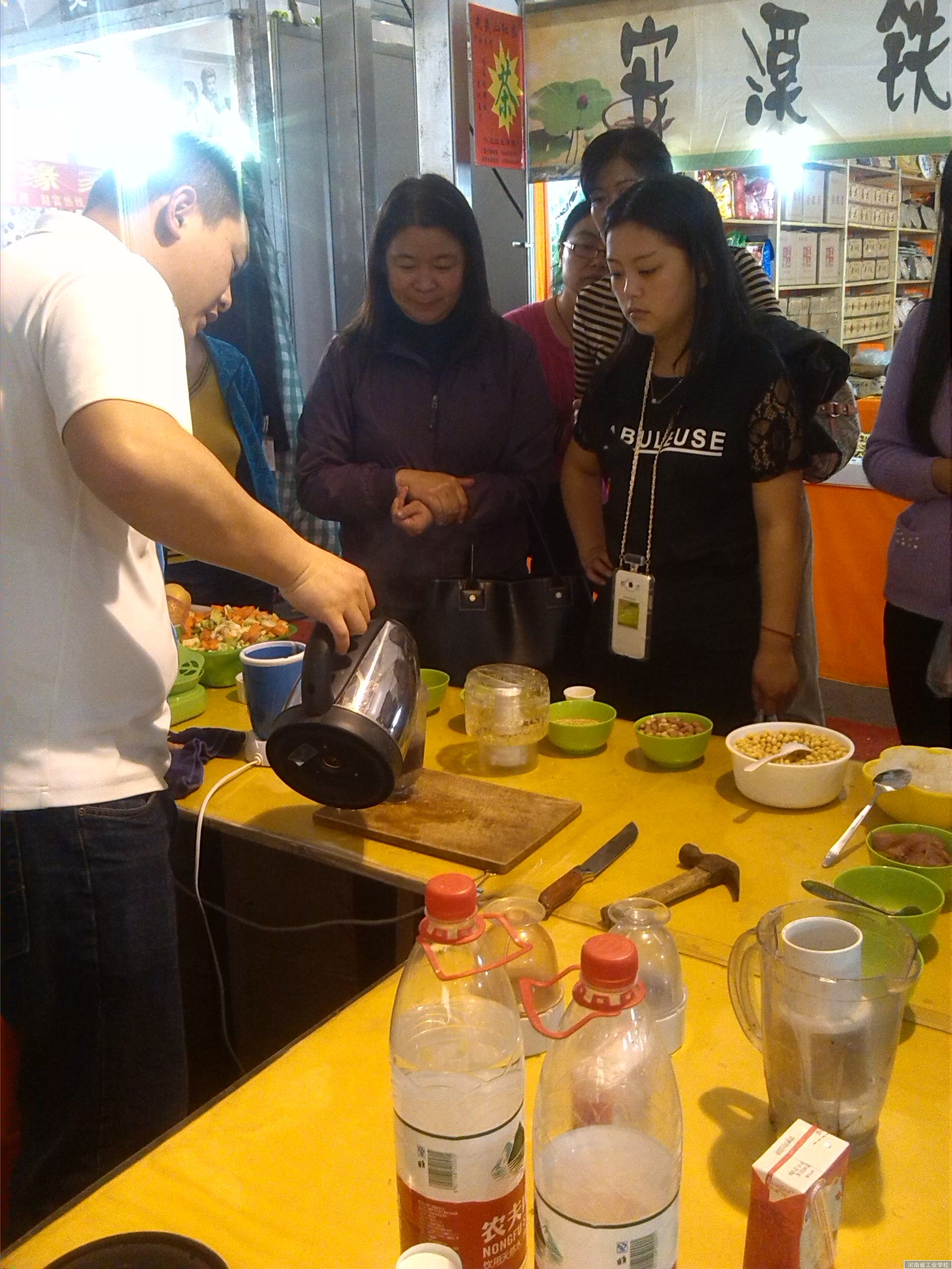到达展销会现场,王老师把同学们分成两组,简单地重复了参观的要求,同学们即按照展区分布进入会场。展销会设有服装服饰区、床上用品区、炒货干货区、海鲜产品区、生活小家电区。各区布展富有特色,参展人员的讲解、接待十分专业,各种品牌产品丰富多彩,聚集人气手段不断创新,看的同学们眼花缭乱。特别是一家台湾生产的料理机的展台前,展区挂满了企业和产品宣传画,展台上整齐地摆放着产品,产品推广人员声情并茂地介绍产品,并现场进行操作演示,让参观的人们品尝其制作的各种食品,同学们被深深地吸引了过去,纷纷向其推广产品的技巧,与之展开操作互动。通过产品推广人员的促销,同学们对这家企业和产品顿时产生了好感,深切地感受到了展销会如何塑造企业和产品形象。