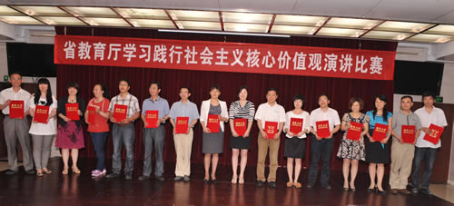 为深入学习贯彻党的十八大精神,推动省教育厅社会主义核心价值观的学习、宣传、践行以及省教育厅社会主义核心价值体系建设,根据省委省直工委要求和省教育厅《关于举办学习践行社会主义核心价值观演讲比赛的通知》精神,5月24日,省教育厅举行了“学习践行社会主义核心价值观、我的中原梦”演讲比赛,整个比赛掌声不断、精彩纷呈。教育厅副巡视员赵国河、省招办纪委书记舒卫建出席活动,并为获奖选手和优秀组织奖单位颁奖。来自厅机关、厅直属单位(学校)的领导和单位代表150余人到场观摩了各位选手的精彩演讲。