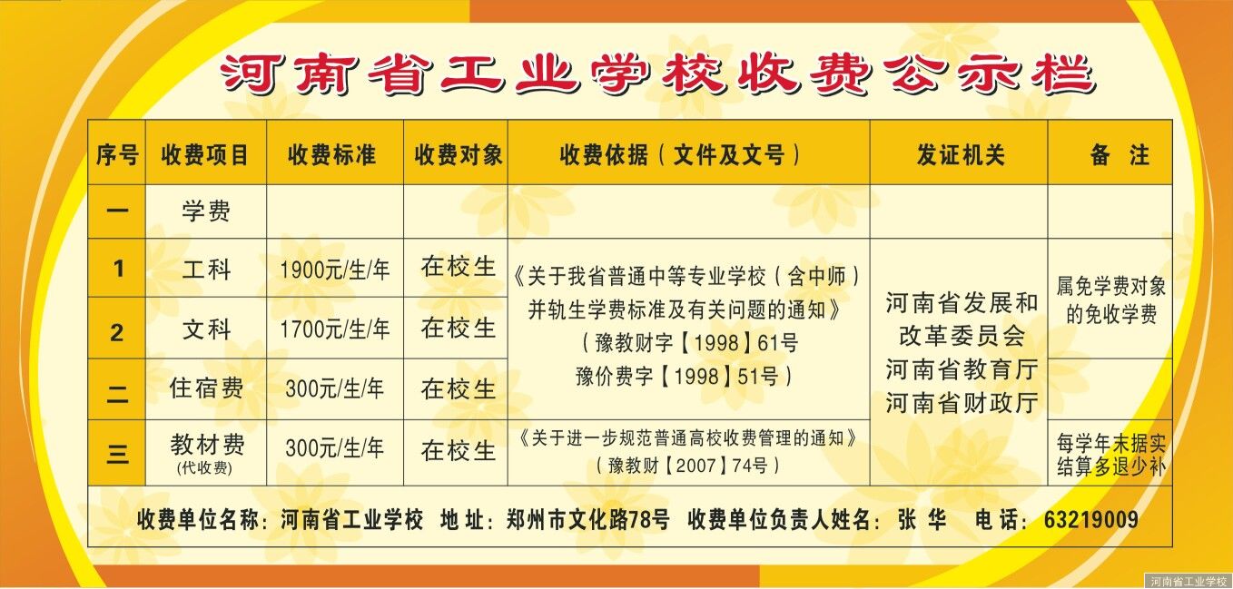 河南省工业学校收费公示栏