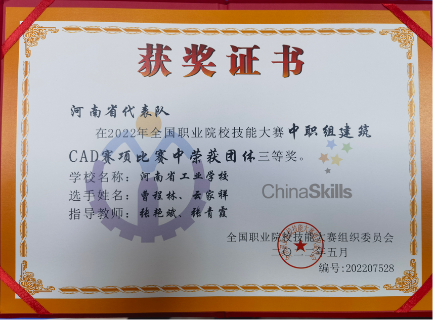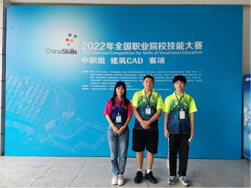 8月4日—8月8日,2022年全国职业院校技能大赛中职组“建筑CAD”赛项在广西城乡建设职业技术学院举行,全国31个省、自治区、直辖市和新疆生产建设兵团的64支参赛队同台竞技。我校学生曹程林、云家祥组队代表河南参赛,荣获团体三等奖,指导教师张艳斌、张青霞获得“优秀指导教师奖”,实现了我校在该国赛赛项中“零”的突破。