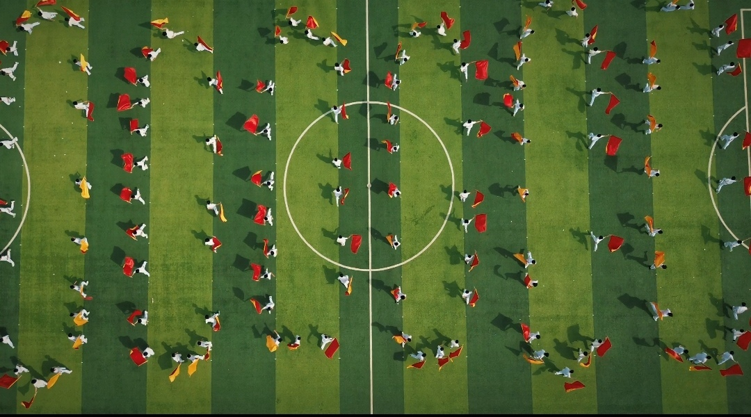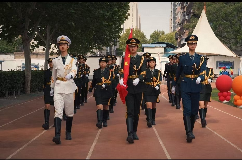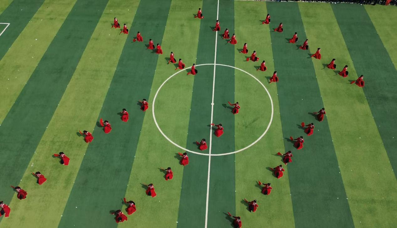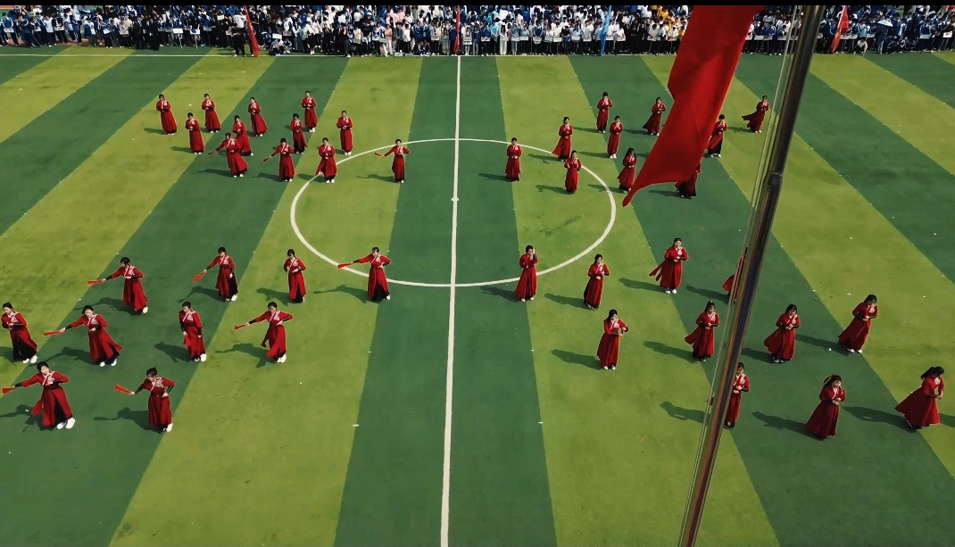 开幕式上,气势恢弘的文艺表演“战旗风”,同学们身着整齐的服装、手持红黄相间的战旗,在震天的呐喊声中整齐划一地挥舞,旗帜翻飞间似有千军万马之势;刚柔并济的文艺表演“象王行”,红色的扇面在同学们手腕翻转间如烽火燎原般绽开,在扇子与鼓点共振的“唰唰”声中,仿佛使人们听见了千年风沙中驼铃与战鼓的和鸣。红旗与扇子交相辉映、灵动的列阵千变万化,仿佛一片绚丽的海洋在不断翻涌,将现场的氛围推向了高潮。