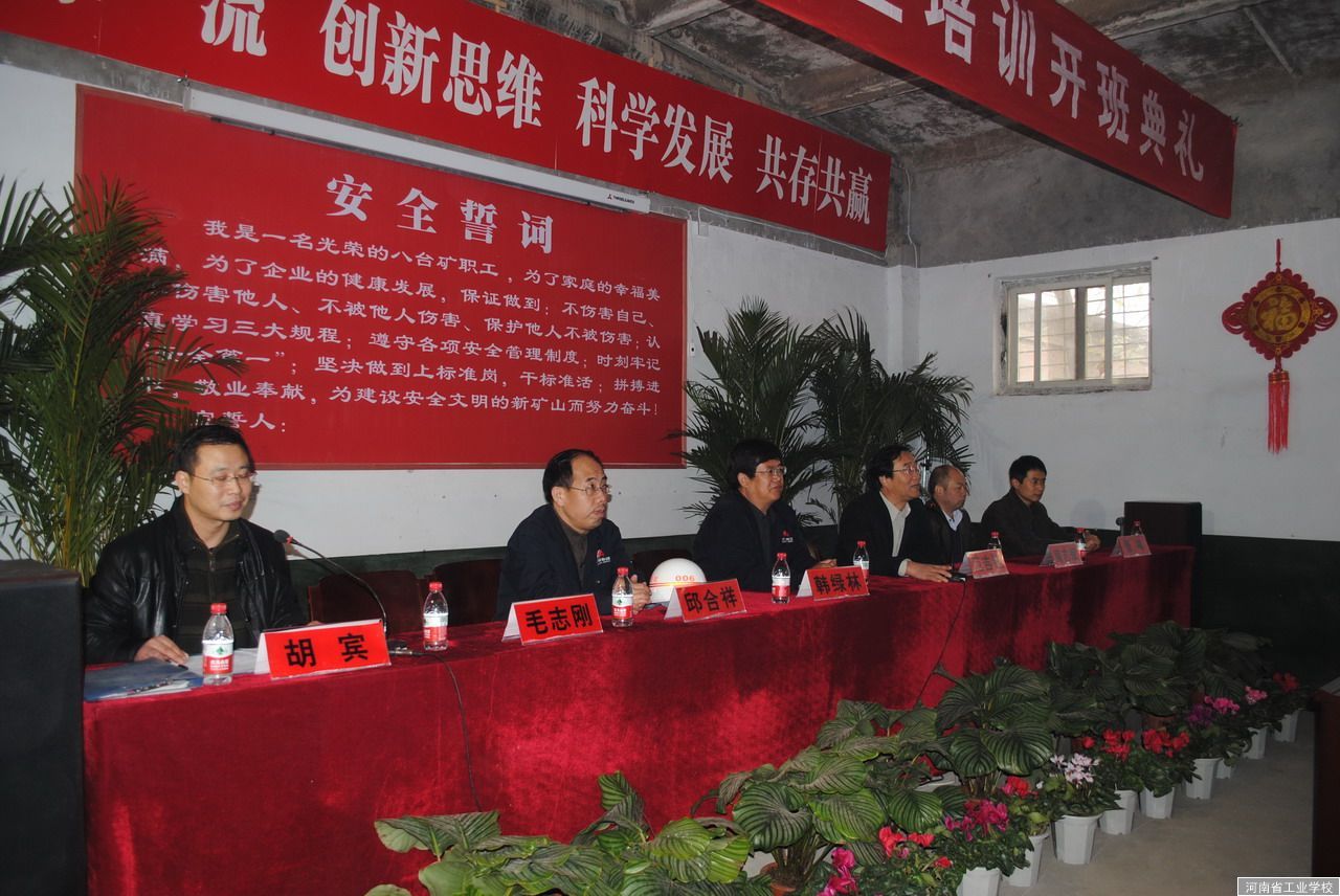 11月19日上午,安钢集团舞阳矿业公司八台矿会议中心隆重举行了“八台矿职工专业培训班开班典礼”,安钢集团舞阳矿业公司党委书记韩绿林、副总经理邱合祥、八台矿矿长胡宾 、河南省工业学校党委书记范吉钰、机电系主任周自斌、材料系主任毛志刚、教师曹峰等出席了开班典礼。典礼上我校党委书记范吉钰和舞阳矿业公司党委书记韩绿林分别致辞,范书记对安钢集团舞阳矿业公司与河南省工业学校校企合作的启动表示了祝贺,同时简单介绍了学校的基本情况,最后要求系部精心组织,任课教师认真准备,圆满完成2012级舞矿班的教学任务;韩书记致辞时首先对河南省工业学校有关领导的光临表示欢迎,介绍了企业的历史和现状,要求职工珍惜本次难得的学习机会,认真掌握专业知识,为今后的工作打下一个良好的基础。