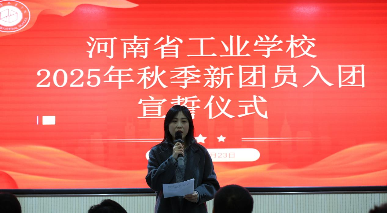 为进一步加强学校共青团组织建设,引导广大青年学生坚定理想信念,传承红色基因,2025年12月23日,河南省工业学校隆重举行2025年秋季新团员入团宣誓仪式。校党委委员、党办及组人科主任尹作为,校团委书记张伟,建艺系团总支书记代子英,经管系团总支书记卢佳会,机电系团总支书记任浩铭出席仪式,与2025级秋季学期新团员共同见证这一庄严时刻。