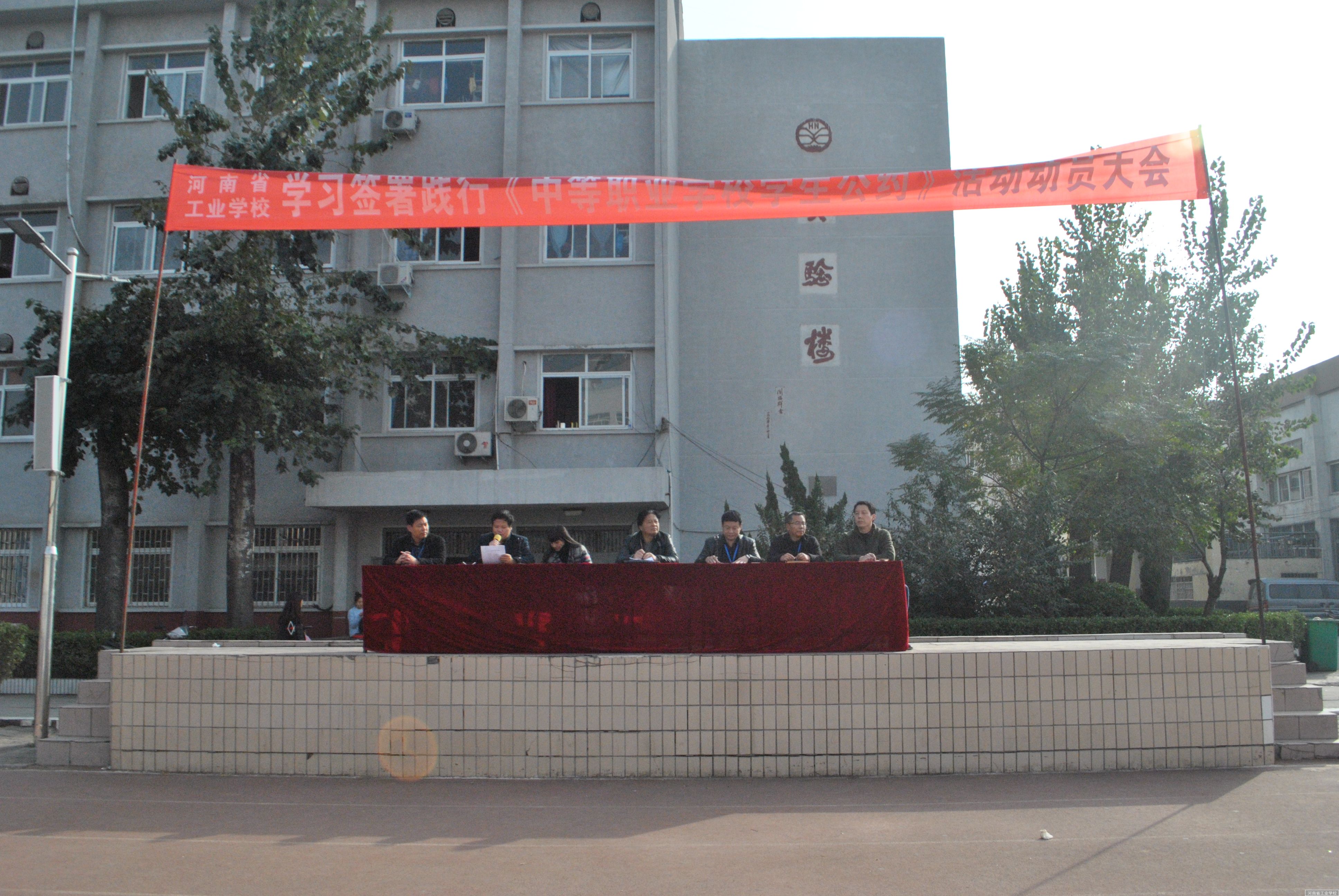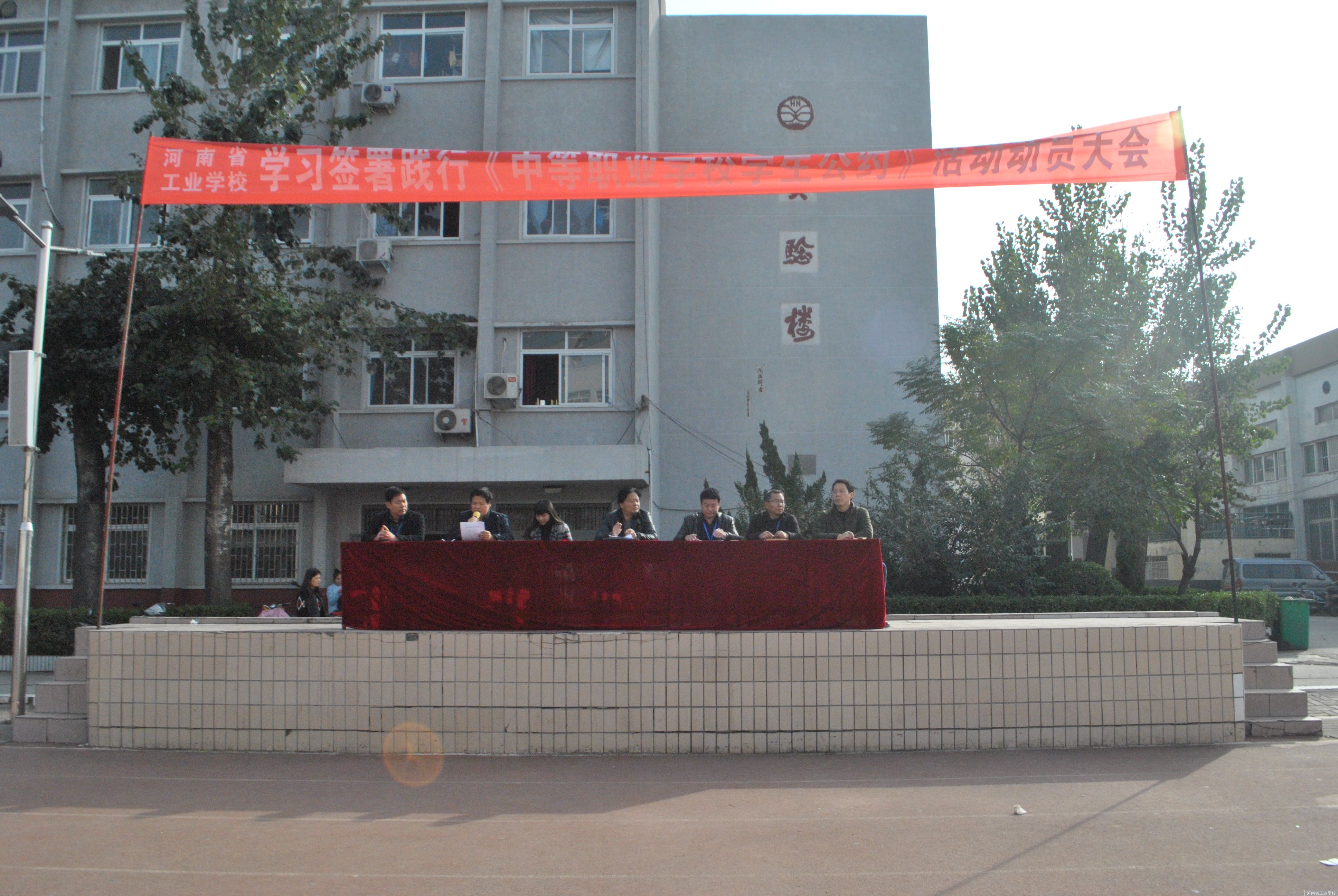 2016年11月10日下午,在学校大操场举行签署践行《中等职业学校学生公约》活动动员大会;大会由校纪委书记刘宝亮主持,学生科长王龙泉同志宣读河南省工业学校签署践行《中等职业学校学生公约》活动方案,张华校长做了动员报告,对我校学生提出了六点希望:第一、践行学生公约,要学会做事,首先学会做人;第二、践行学生公约,树立正确的审美观;第三、践行学生公约,要注重道德修养,不断完善自我;第四,践行学生公约,要敏而好学;第五,践行学生公约,要严以律已;第六,践行学生公约,要宽以待人。