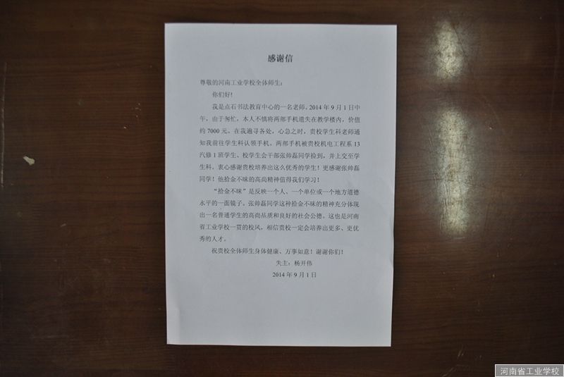 2014年9月1日下午2点20分左右,我校学生会干部、机电工程系13汽修1班学生张帅磊在教学楼内捡到苹果、三星两部手机(价值约人民币7000元),在财物面前他没有动心,而是立即将手机交给了校团委冯老师,并委托代为寻找失主。经联系,失主为点石书法学校杨校长,杨校长领取失物的同时对学校的管理教育水平和张帅磊同学拾金不昧的精神大加赞扬并深表感谢。