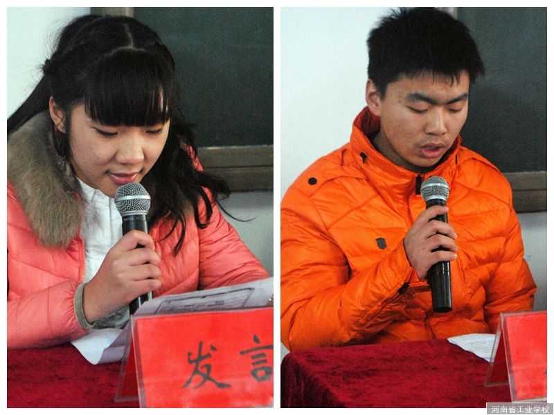 李悦副科长为新团员代表佩戴了团徽,老团员代表14机电团支部杨晨阳同学和新团员代表14会计团支部金月然同学分别做了发言。