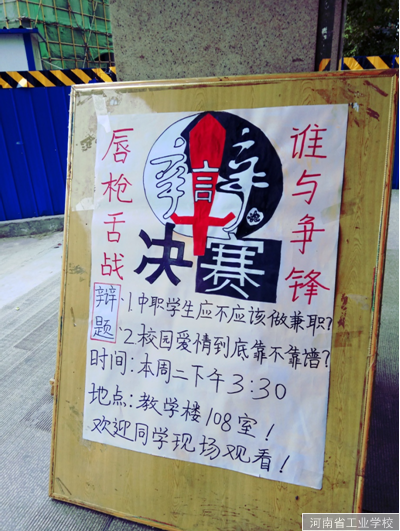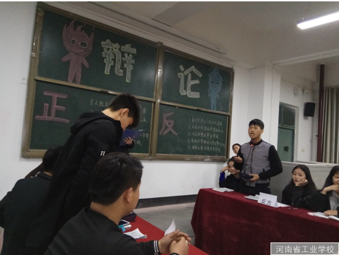 3月28日下午,校第一届校园学生辩论赛决赛在208阶梯教室举行,12名辩手分为两组分别就“中职学生应不应该做兼职?”和“校园爱情到底靠不靠谱?”两个辩题进行了辩论。