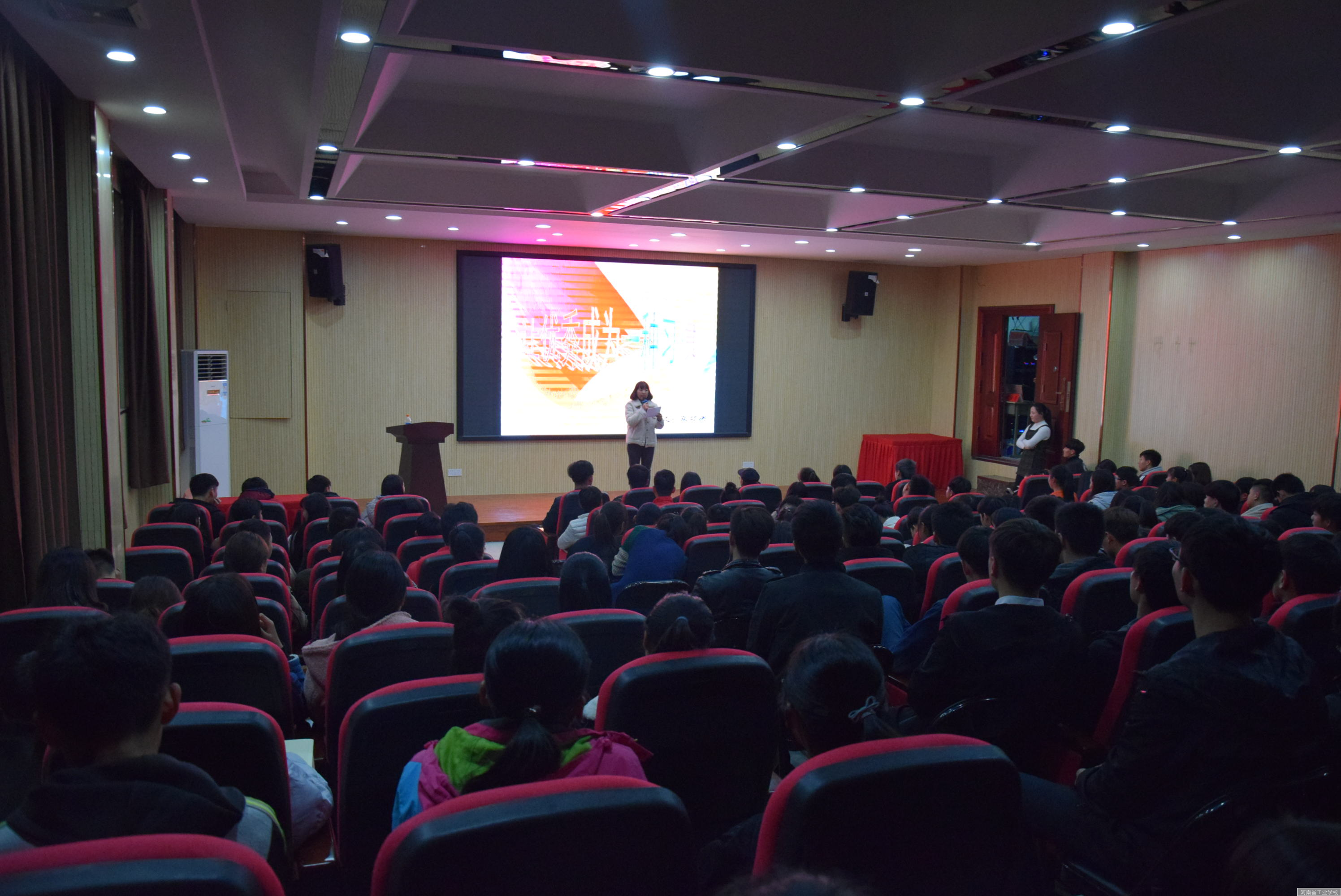 2017年11月28日晚七点,我校第九届学子讲堂在第二报告厅顺利举行。本期学子讲堂由17商务1班学生宋佳蔚主持,16会计2班张丽娜以及16航空班张龙同学主讲,全校150余名学生参加。