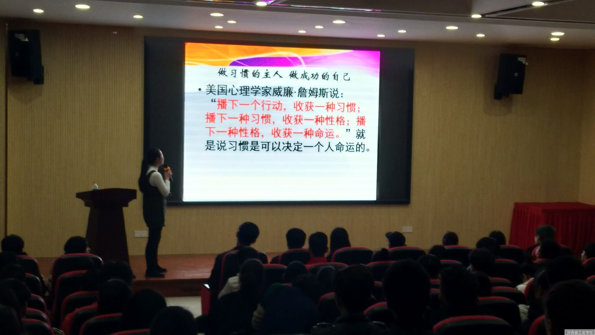 张丽娜同学讲的主题是“让优秀成为一种习惯”,为大家分析了要想让优秀成为一种习惯需要什么? 什么阻碍着你进步?美国心理学家威廉詹姆斯说:“播下一个行动,收获一种习惯; 播下一种习惯,收获一种性格: 播下一种性格,收获一种命运。”通过一个举一反三的小故事,告诉了同学们有一个优秀的习惯有多重要。