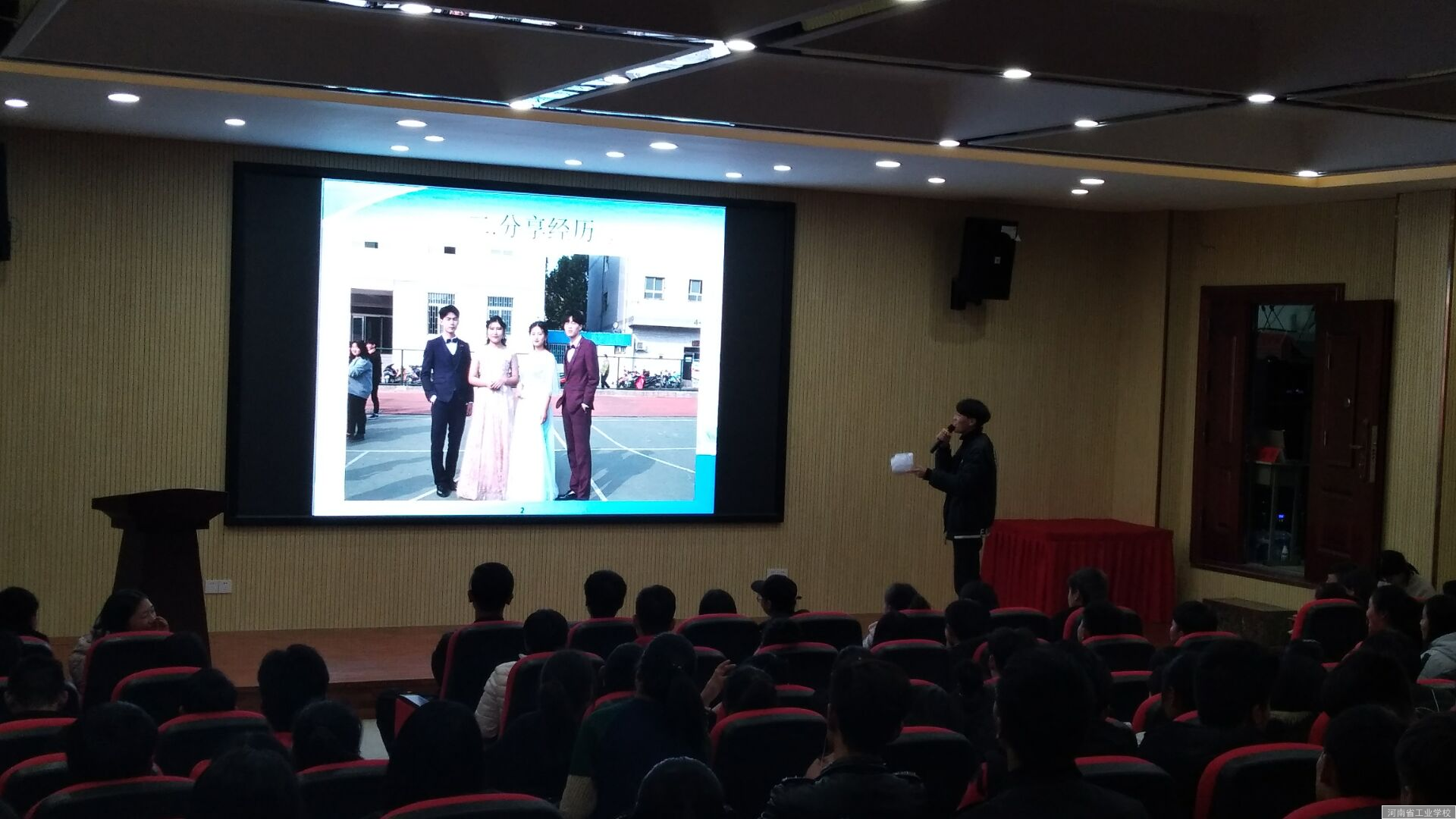 张龙同学向师生们展示了自己在校及暑假工作期间取得的成绩,身兼校团委广播站负责人,纪保部部员等多重身份,充实的学业生涯和实习就业经历让同学们惊叹不已。张龙同学言语幽默、深入浅出,配合生动有趣的照片,在座的各位同学听得聚精会神,现场笑声不断、掌声连连。