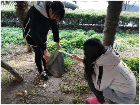 11月23日,校志愿者服务大队10余名队员在校园内开展捡垃圾活动。